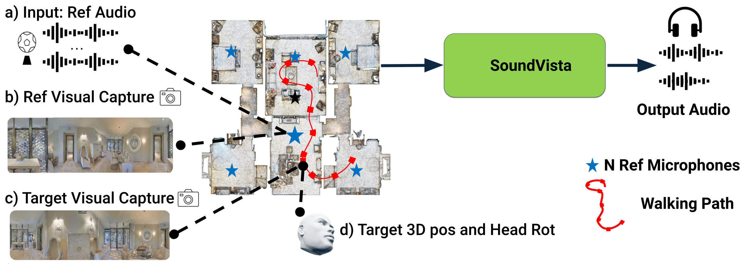 SoundVista is a novel method for synthesizing binaural ambient sound from arbitrary viewpoints in a scene. It leverages pre-acquired audio recordings and panoramic visual data to generate spatially accurate sound without requiring detailed knowledge of individual sound sources.