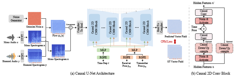 This work introduce a new framework for real-time, high-quality binaural speech synthesis using flow matching models. Rather than treating binaural rendering as a regression task, we approach it as a generative problem, allowing us to better model complex spatial cues, room reverberation, and ambient noise that aren’t present in the mono input. We design a causal U-Net architecture that predicts future audio solely based on past information, making it well-suited for streaming applications.